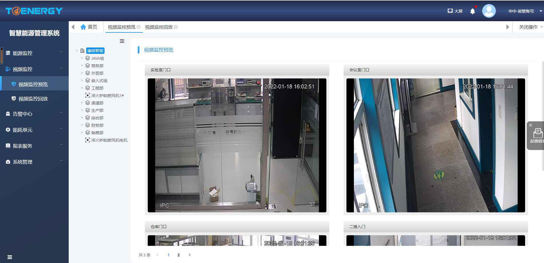 對(duì)組織機(jī)構(gòu)下的攝像機(jī)進(jìn)行實(shí)時(shí)預(yù)覽、視頻回放。多維度掌握設(shè)備運(yùn)行情況,異常侵入可視化避免電氣火災(zāi)和保障用戶人身安全。