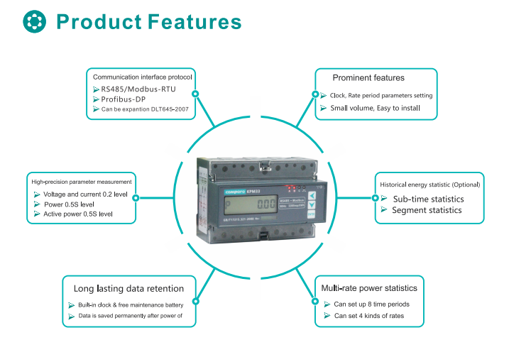 KPM33 three-phase guidway typesmart energy meter with DIN35mm guideway typeinstallationstructure, LCD display, measurement of electrical energy and other electrical parameters,it can setsome parameter, such as the clock,rate period,etc.