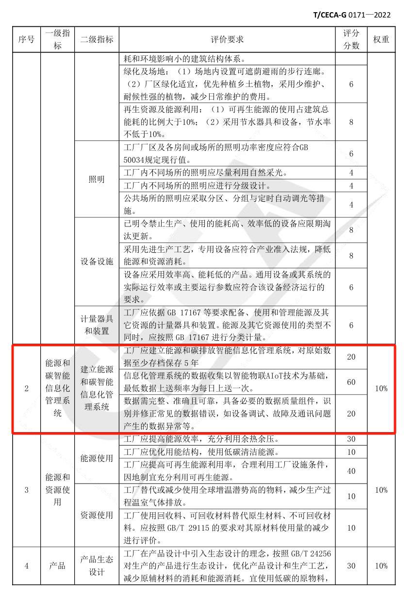 零碳工廠:中國(guó)節(jié)能協(xié)會(huì)發(fā)布的團(tuán)體標(biāo)準(zhǔn)《零碳工廠評(píng)價(jià)規(guī)范》中表B.2零碳工廠評(píng)價(jià)要求表中一級(jí)指標(biāo)中能源和碳智能化信息管理系統(tǒng)的二級(jí)指標(biāo)能源和碳智能化信息管理系統(tǒng)的具體評(píng)價(jià)要求中建有能源管理中心可以+100分,占比10%。